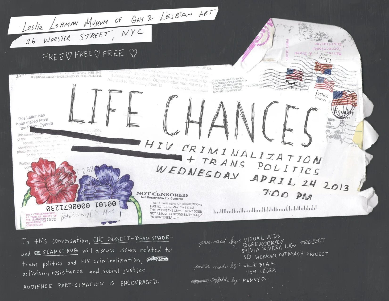 LIFE CHANCES: HIV CRIMINALIZATION + TRANS POLITICS: Life Chances, examined discriminatory laws and regulations such as "stop and frisk" and "condoms as evidence", disclosure, and other rules, systems and norms that reduce life chances for trans people and/or people who are living with HIV. In this conversation, Che Gossett, Dean Spade, Mitchyll Mora and Sean Strub discussed issues related to trans politics and HIV criminalization, activism, resistance and social justice. The conversation was hosted by Laverne Cox. The event was organized by myself, Cassidy Gardner from QUEEROCRACY, with help from Reina Gossett and people at the Sylvia Rivera Law Project and the Sex Worker Outreach Project New York . The poster was created by Kenny O, Julie Blair and Tom Léger. (Transcription forthcoming) MORE INFO ON THE POSTER.
