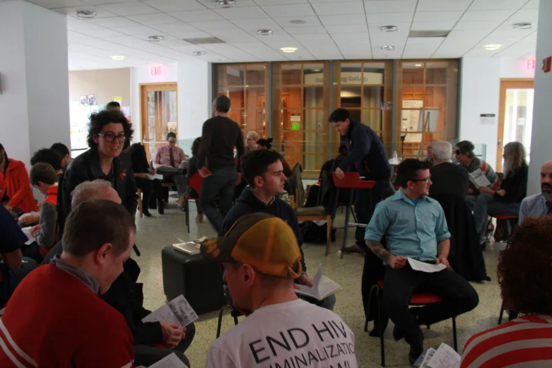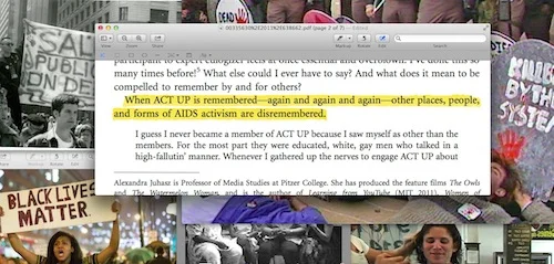 “Forgetting ACT UP”: In her essay “Forgetting ACT UP”(Quarterly Journal of Speech, 2012), filmmaker, activist and academic Alexandra Juhasz explores the idea that, “When ACT UP is remembered—again and again and again—other places, people, and forms of AIDS activism are disremembered.” At this 2015 event at the Bureau for General Service: Queer Division, I facilitated a discussion in which attendees explored Juhasz’s essay, as well as discussed what her argument meant at the moment when some responses to early AIDS activism are being remembered, while much of what has happened has yet to be remembered, reclaimed, and acknowledged. How does this lack of remembering fit into discussion and action around #blacklivesmatter and how does it impact work being done presently around HIV/AIDS?