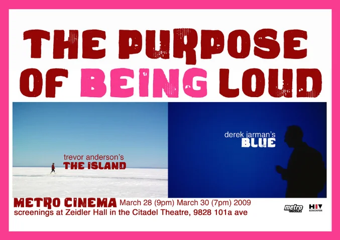 The Purpose of Being Loud, 2009, screening Trevor Anderson's insta-classic, The Island, with Derek Jarmen's iconic BLUE. At the heart of both is isolation, HIV stigma, and desire to see and be seen.