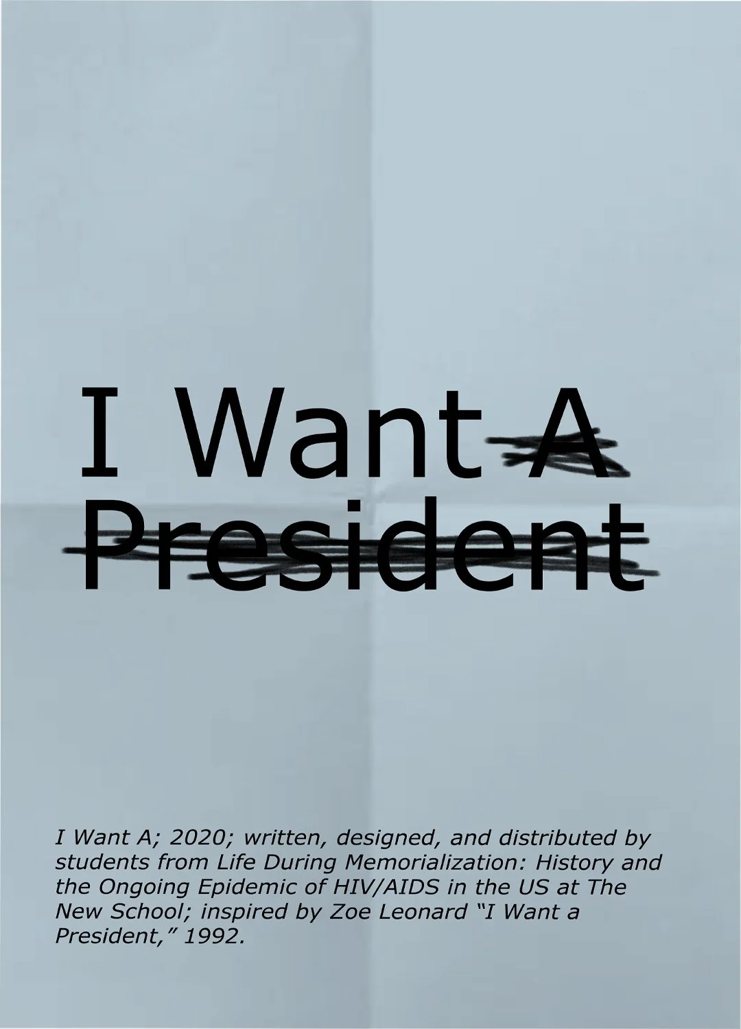 I WANT - project with students. About this project, David Moore reflects: Inspired by Zoe Leonard’s I Want a Dyke for President, our class [about AIDS at The New School] has collectively composed a piece that embodies community activism in written and spoken word. This student-driven collaboration is a raw and candid call for change and community-based solutions, as opposed to resolutions to social issues seeped in capitalism, authoritarianism, and a self-serving government. This piece memorializes and speaks to, and for, those who live on the periphery of the “American Dream,” and intentionally out of view of the elite. For those who seek equality and long for prosperity. The debut of “I Want a _______” signifies the need to hold our leaders accountable and calls for continued community-based movements that employ the power of activism to ensure everyone has a seat at the table. Read and hear the poem here.