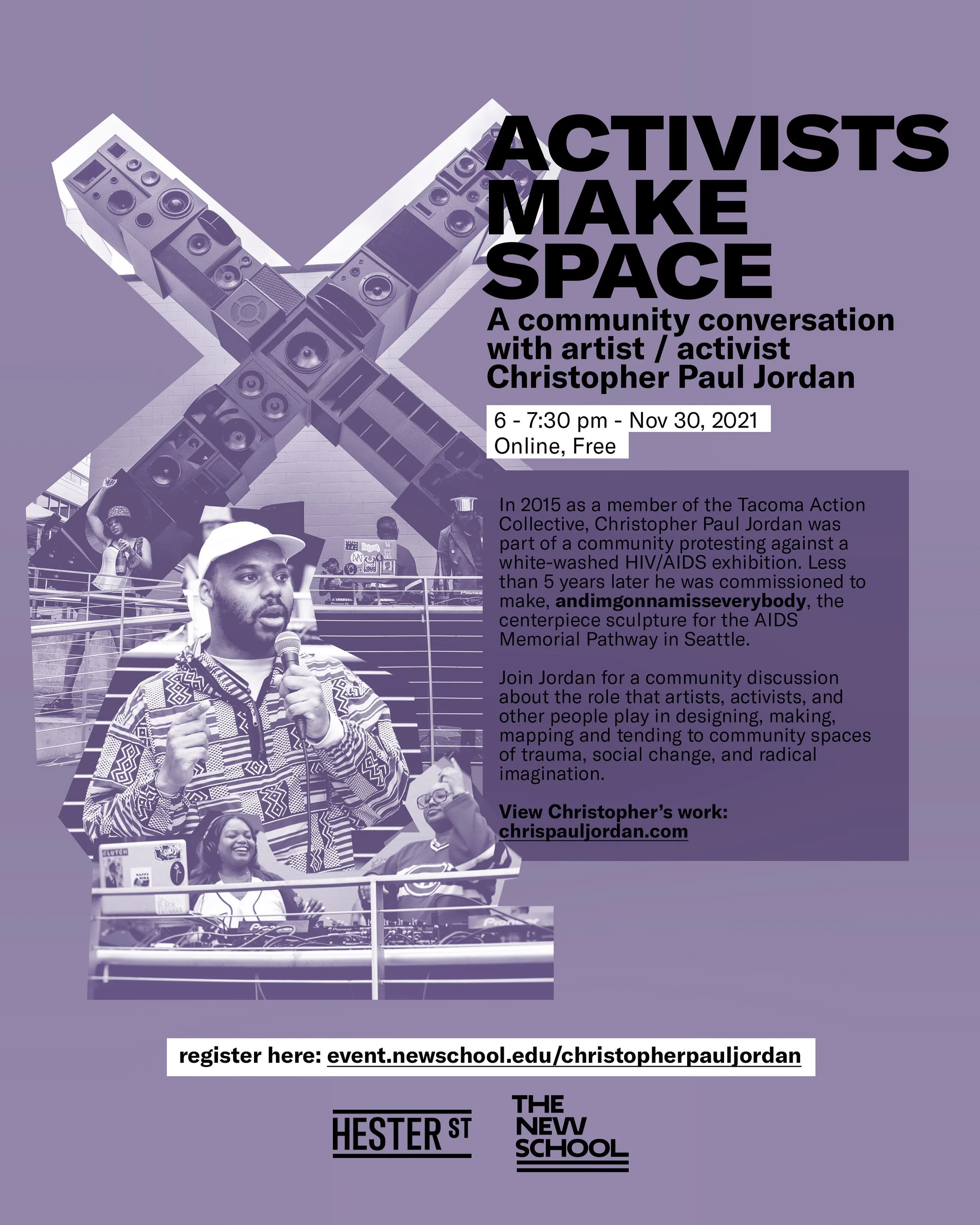 ACTIVISTS MAKE SPACE: A community conversation with artist / activist Christopher Paul Jordan In 2015 as a member of the Tacoma Action Collective, Christopher Paul Jordan was part of a community protesting against a white-washed HIV/AIDS exhibition. Less than 5 years later he was commissioned to make, andimgonnamisseverybody, the centerpiece sculpture for the AIDS Memorial Pathway in Seattle. At this event Jordan spoke about the role that artists, activists, and other people play in designing, making, mapping and tending to community spaces of trauma, social change, and radical imagination.